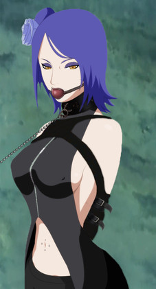 Here's the first Anko edit request. Instead of a ball gag, she's been given a wiffle gag harness and a blindfold.I approve.