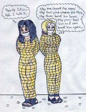 This idea was suggested by . Only the illustration is mine, so if you like the idea thank StrippinHeat.Oh Temari, this is the third time you've graced my gallery. You just can't stay out of trouble! This time Kankurou has wrapped Temari up like one of his puppets. They look like they're about ready to leave. I wonder where to? Maybe he's taking her to Shikamaru~ Or maybe not! Who knows.