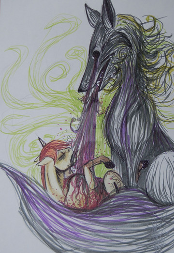 I can see why you enjoyed drawing this mane. All the beautiful curves and lines, interwoven so closely. The part in front, the two stray strands, makes it even better, and the way they freely curl and twist downwards is great. The sharp ears make a very good-looking counterpoint to this voluminous manestyle, and it all works very well with her face. Those eyes are gorgeous, and that dab of colour on her eyelid is really all the picture needs. Feels very... artistic, for lack of a better word.