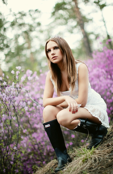 Nice and crisp shot. Everything has good contrast from the sticks on the ground up to the tree. Good looking model with an audacious expression betweenΒ nubile andΒ cheeky. Like it.