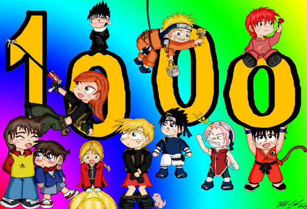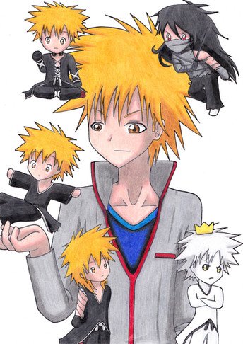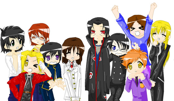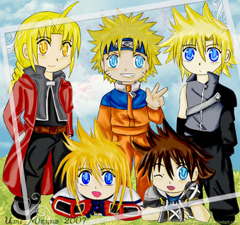 It's done!!! I know, Sasori's hair is totally messed up and Zack really deserves more muscules but I suck at anotomy so unless somebody wants to see Zack have tumors on his arms I refuse to add more protein there and I don't even know if I got the color for Cloud's eyes right I can't remember if Mako eyes are green or blue whatever since Sakura's eyes are green I just made Cloud's eyes green to save trouble and if anyone's wondering I'm not that much of a gamer so I hardly know any games let alone game characters luckily I've got a Zack obsessed friend who keeps talking about him so I guess I'll just stick two characters from Final Fantasy in there well technically Naruto is a game now and so is Bleach so-- *shot*......did anyone actually read anything up there...=w=?