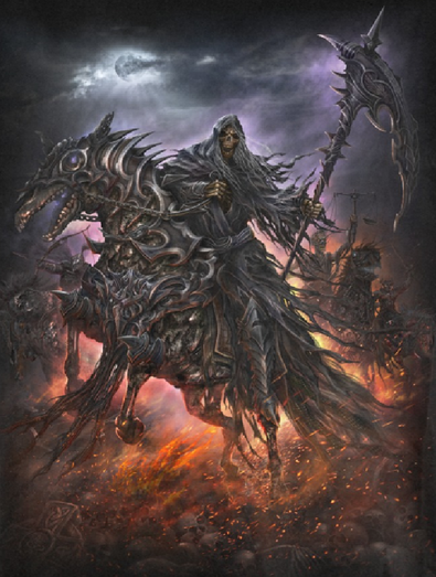 I see a concentration camp. The sun is the illusion of safety. The white light of the moon and artificial lamp are the knowledge of the reality, harsh and cruel as it is. The skeletons--modern twists on the classic grim reaper--are guardians because in the world of the concentration camp, death becomes the deliverer.