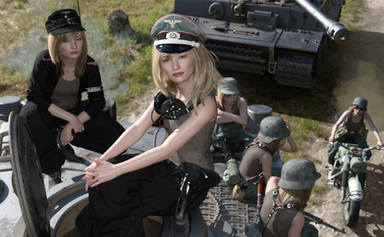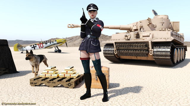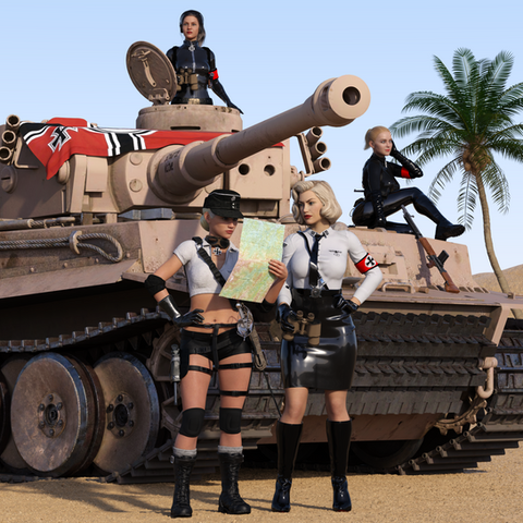 Elitesoldatin Zara has just reached the forward base in the desert. Preparations are being done for a new expedition to find an important artifact. In the background, on the right side, Officer Mara and Instructor Isra watch, while Elitemaedchen Katinka and Masha help out by carrying equipment. On the left, a platoon fof Elitesoldatinnen is marching.Zara is AmethystZara