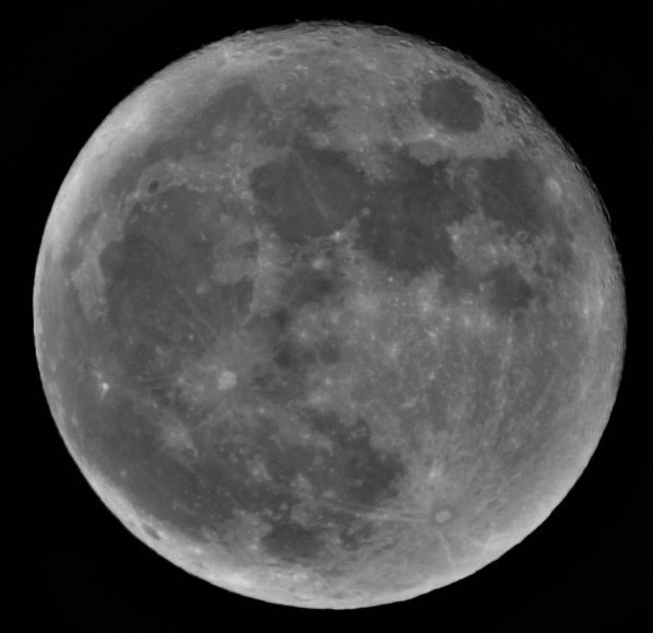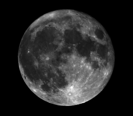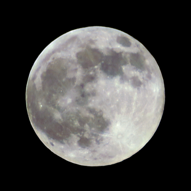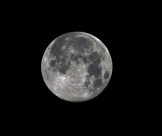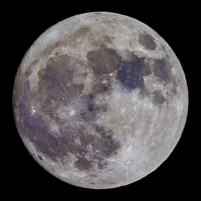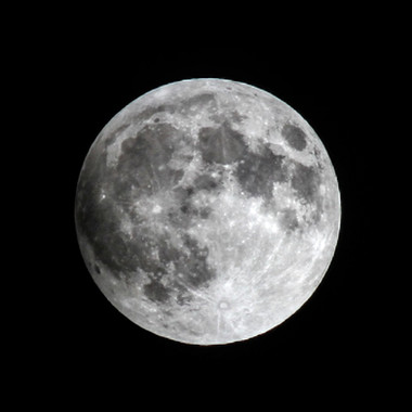My first attempt ever to layer stack disparate exposures of the Full Moon. 4 different exposures taken 2 hours before the recent Lunar eclipse were transformed to High Dynamic Range (HDR) images, then aligned, then stacked with Photomatic to create a single image, which was then adjusted for correct white point and color balance. Like the eclipse photos, these photos were taken with a 127mm Maksutov-Cassegrain telescope and the 1D Mark III DSLR. Together, this comprises a 2002mm f/12 optical system. 16-bit TIFF was used for subsequent processing, which was done in Photoshop to create the black canvas and to tune for less chromatic aberration, in Light Zone to remap the highlights, and to convert to JPEG, with a final stop in Noise Ninja for noise cleanup.Related content