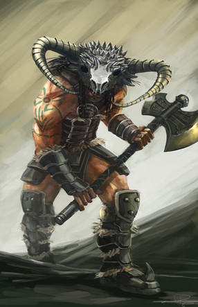 Great piece. The flakes of fire or metal glinting above and below the blade add some dynamic texture and lighting to this piece. The armor is smooth, but those horns on top and the axe really let you feel the offensive nature of the character too. Good stuff.