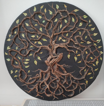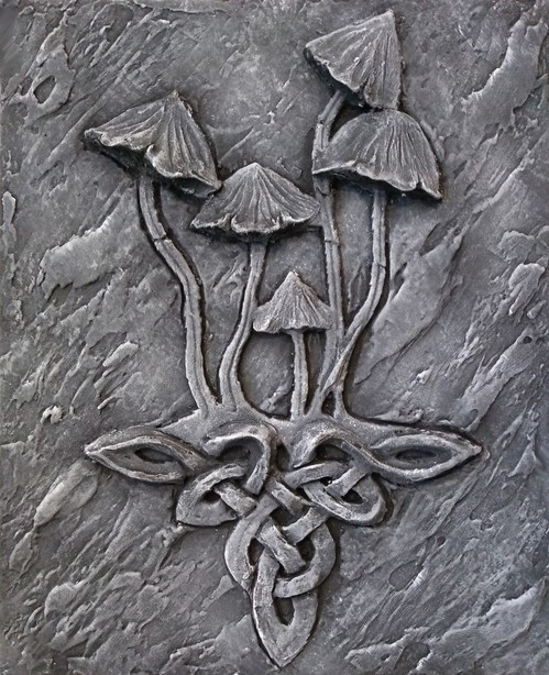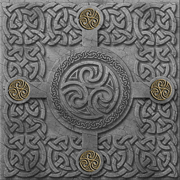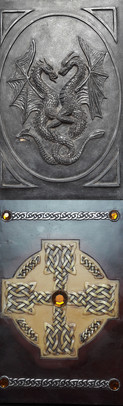 I made these a few years ago using wooden frames, coated with tile grout to produce a roughened texture like wood or stone, The knot-work was made with air drying clay and placed onto the grout and painted when dry.Related content
