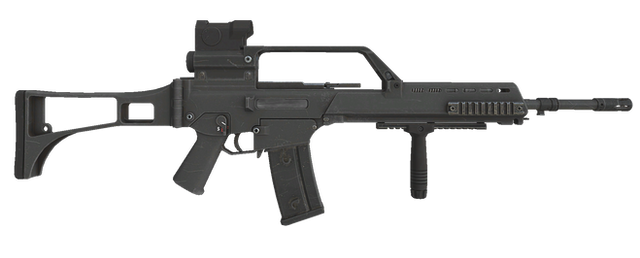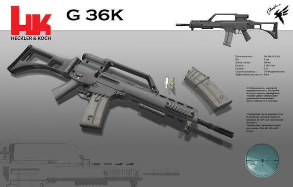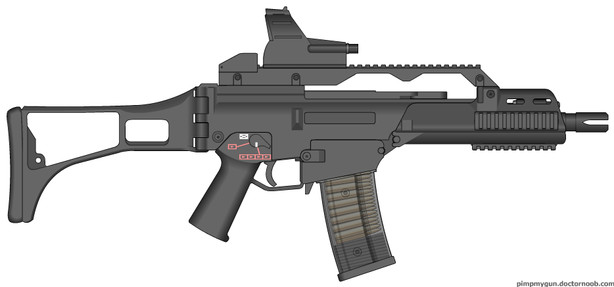G36 with ACOG scope, HK Grip, Quick release sling, Flash hider, Buttstock with cheek rest5 round magazine loader on table.