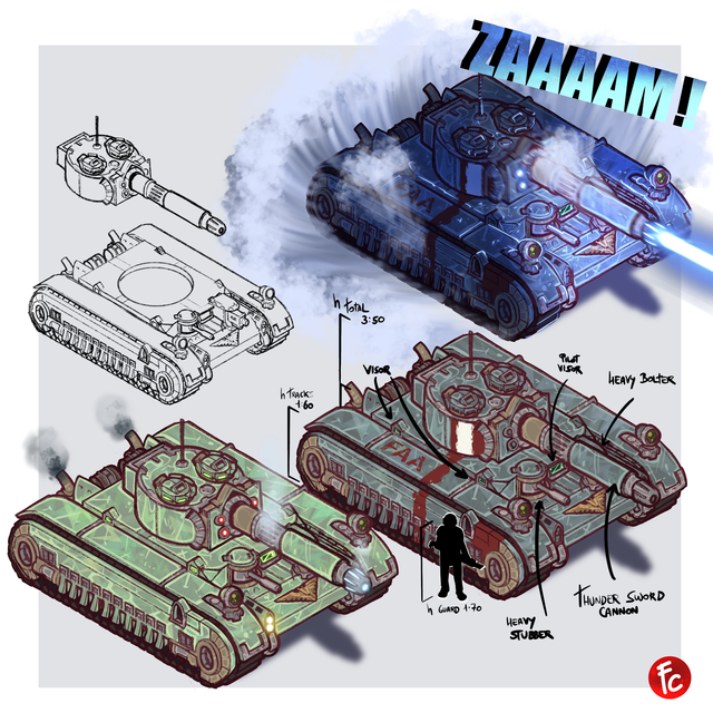 Looks very nice and very warhammer-ish and the amount of details is amazing. But I believe it would have serious problems in reality, because there's too much weight on the front (two massive guns + all their needed equipment + stored ammo + that massive dozer blade). This problem had JgPz IV and they just reinforced frontal armor slightly and yet the vehicle began to bog down with it's nose.