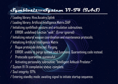 “While the first generation of KD-100s are a war winning marvel, it’s the second generation that most fascinates me. Since male and female drones are able to take a copy of half their ai and combine it together much like a sperm and egg, they’re capable of creating new AIs. Although since they can’t assemble physical bodies so we’ll still have to manufacture them, beyond the technical however is the social. I don’t know how well an entire population of combat vets who had no parents, can care for their offspring and how they’ll then handle their children.”- KRRF Head of Research Kyle Ferdan Report on AI Procreation