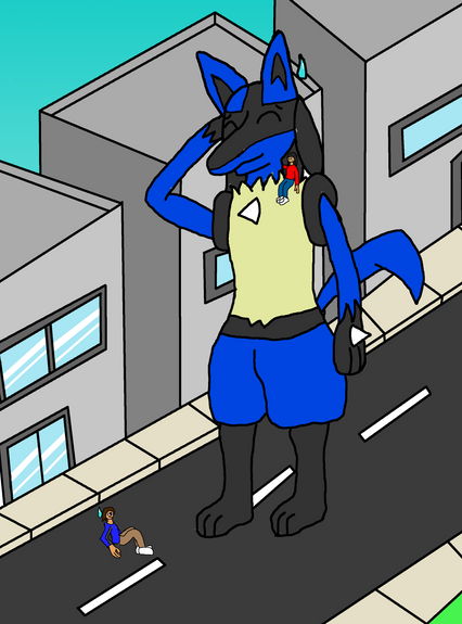A request from . He requested that I draw his character, Rio, meeting Silver for the first time. It went a little something like this. Rio being surprised by Silver's giant size, and Silver trying his best to calm Rio down, and assure him he's not a monster.As for the drawing itself, despite taking forever and a half to get it done, i'm rather happy with the way it turned out. I'm still no good at drawing city backgrounds, but I'm trying to improve in that aspect. The shading, especially on Rio, turned out really well. I just wish that you could see Rio clearly... i had to scale him down. I drew him Silver's size then rescaled him in GIMP. It works. Rio has a lot of detail and i can't draw all that that small. So anyway, sorry it took so long Gab. I'm trying to shorten the gaps between when i upload things.