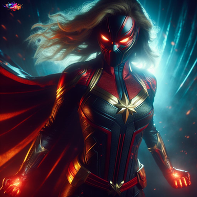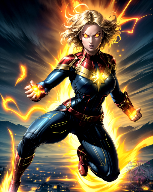 Captain Marvel amidst destruction caused by her own hands.Realization dawns; she's become what she always fought against.
