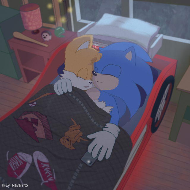Sonic, not as tired as his friend, watches him sleep, protecting him from all stuff that might hurt Tails in any way.