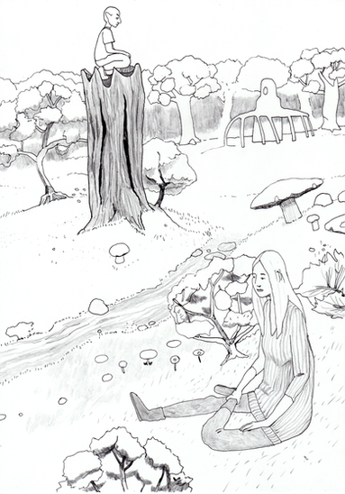 Harbinger, 14x11″, pen, ink, markers, on bristol. Panel from a new comic.BTW: Dörfler is now available from Fantagraphics: www.fantagraphics.com/dorfler/
