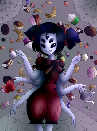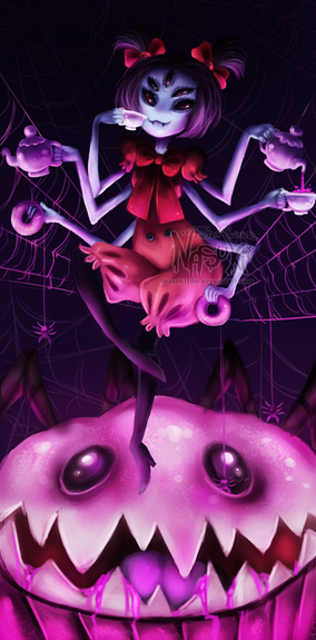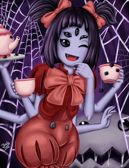 Love this game called 'Undertale'. Especially that very funny character called 'Muffet', a spider lady who loves a cup of tea out of her gloomy tea cans (it that really tea?). She's a boss in a dark cave who challanges you, because she heard humans loves to ripping of the legs of spiders. That girl is so cute, even as a sprite. So finally, after all these months I did a very nice interpretation of her sprite. Hope you enjoy the drawing!If you share this content, please link to my profile!!!