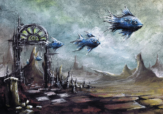 Beautiful - especially the colors. I've always liked coming across the odd project on cardboard, and the flying fish remind me of James Christensen. :^) !