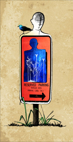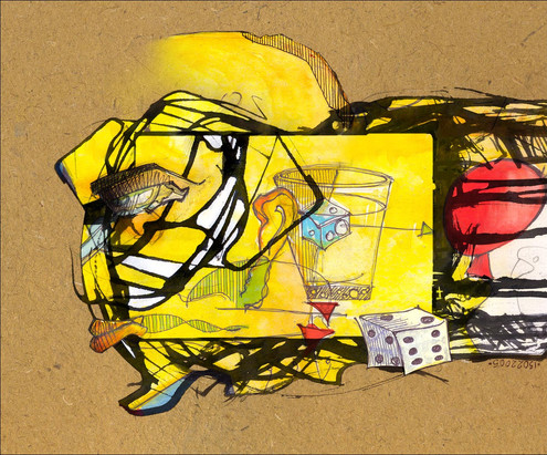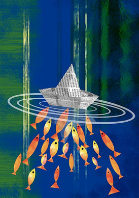 Interesting. The checkerboard portion in the lower half of the image seems to evoke a certain Escher tesselation, but then it would have had the fish entering the black tiles displayed with more prominence. The article about suntan was an interesting choice for a collage background, as was the cardboard. I have seen cardboard artwork before, it's a wonderful medium to work on, more people should try it. The horizontal/vertical positioned fish in the center are interesting, all chaotically moving in opposite directions, not at all a unified school of fish. The uppermost group fish seem as if you were attempting to draw them with realism, but needed more art reference photos/diagrams to study. The ladder in the upper right is especially intriguing, perhaps it is the ladder aside a dock, leading down into the water, symbolising the gap-bridger between two entirely different realms, which the fish have learned to somehow climb so that they now move above the dock as well as in the dark checked depths below the water.