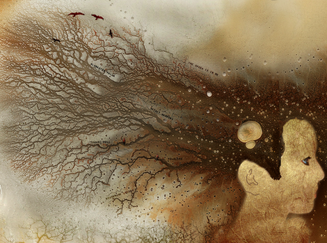 The black looks like it's going to bleed over the sun-like thing. At the same time, though, the sun's rightward position makes me feel like it's out of harms way, that even if the black covers everything up, the sun will still shine through. And the black's obviously negative because everything above it seems melted, twisted, and burning.