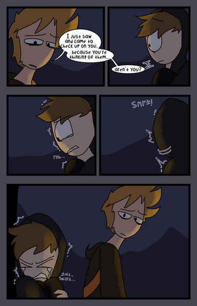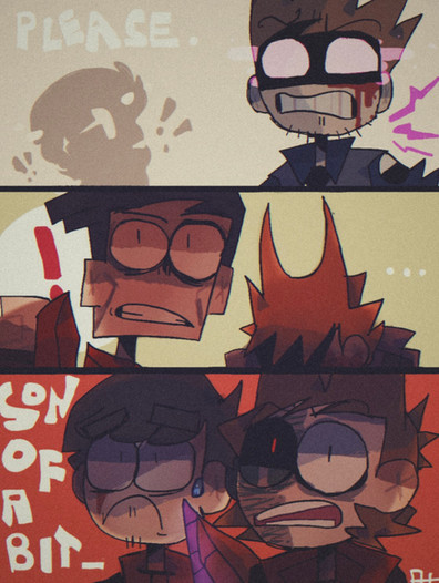 Not gonna lie though, Edd's appearance bothers me a bit. He's adorable af, don't get me wrong, but if I saw him out of context, I don't think I'd know that's Edd. Tord and Tom though, I'd definitely be able to tell. But that's just a nitpick, it's an au, do what you want! The art is great anyway