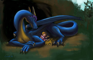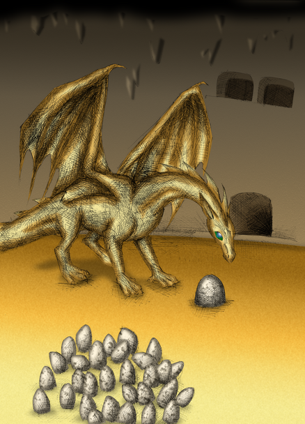 I'm kindof in love with Anne McCaffrey's Pern novels. The Pern world is so vibrant and intriguing to me, with so many interesting characters. Now, I'm not the best photoshop painter in the world, but I felt compelled to do some fanart for the series, so here is a golden queen dragon tending to her clutch of eggs, including a golden queen egg.Yes, I know queen eggs aren't described as glowing like that, they just "gleam" supposedly, but I liked the effect.