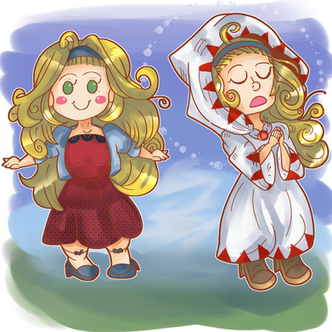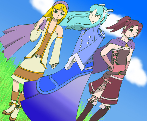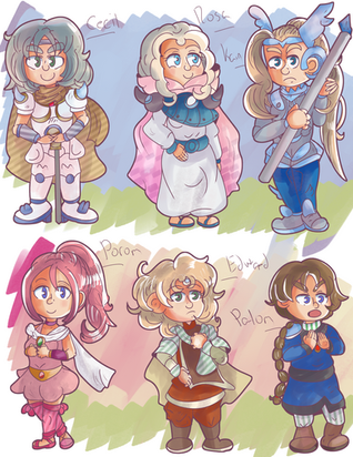 Quick doodles that probably need more shade/texture/ect., but the thick outlining/different faces/expressions and such was purely 100% experimental and meant for fun.I keep meaning to draw my FCs Serafina (far left) and Lieselotte (far right) more often -- well, maybe Serafina. =X Lotte gets a lot of spotlight time because I am a bad mun and blah I've RPed her maybe like ONCE via our old group/mentioned her a few times in various fanfics I wrote, but I don't want to forget her because ...