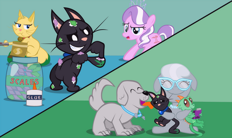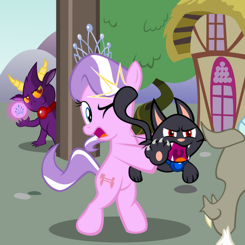 The twisted innards of Dazzle's psyche made manifest, Cat Dazzle may be the most monstrous pet in Equestria. While normally one can't get much beyond the fangs and claws before he tears you to shreds, delving past his general unfriendliness reveals an even more destructive personality of unremorseful selfishness, a bloated unchecked ego, and a level of sadism one could only find in a verified feline. Unless you've got the magic touch, stay far away.