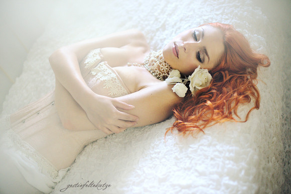 The composition here is perfect. The angle and the way the model is laying fit nicely together. I think the parts that work best for me are the way you've positioned the pedals in a curve and the way the sheets curve in the opposite direction. Your lighting is spectacular and is what makes this portrait hit the nail on the head. It creates a glow to the model's face and compliments her expression so well.