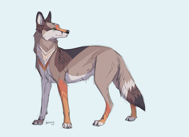Love love love! ^^" The anatomy is great except for one tiny little thing (normally coyotes have slightly longer, pointier muzzles), but it works with the style and the cuteness factor is through the roof!Β