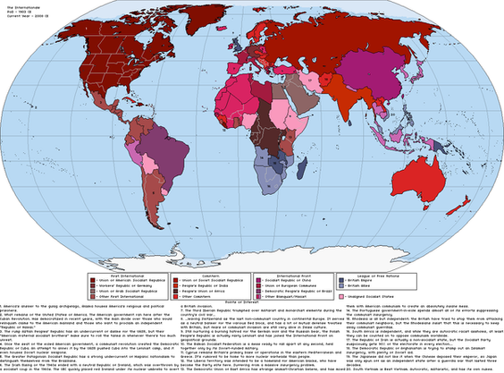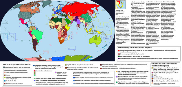No one knows for sure when the transition from the Soviet Union to the Universal Soviet Union took place, since very little information leaks out of the place, but most western experts date its birth with the ascension of one Gregori Morchenko into the seat of General Secretary after Stalin’s death in 1956 and the intervention and assimilation of China during the Chinese Civil War in 1958. Ever since Morchenko’s rise things have become rather...odd. The assimilation of Russia’s Eastern European clients was only the beginning of a string of international incidents to which the West was too distracted to intervene against. This was followed quickly by a revolution in Persia and an invasion of Afghanistan. The Indian Incident of 1967 was the most recent of these incidents, where the Soviets watched as Indian nationalists fight the British for independence, only to march into an exhausted nation unopposed when the British finally withdrew. Only the arrival of American soldiers prevented the total collapse of the subcontinent. Ever since then the Universal Soviet Union has been eerily quiet, with little more than your average propaganda emanating from it calling for unity of all peoples at any cost. Yet inside its borders, many westerners would shiver at the extent of its “Revolution of the Proletariat” has gone. The renaming of cities based on numbers, with its new capital of City 1 located where Almaty once stood standing as the prime example, the pacification of the masses through propaganda and cheap distractions and the effective separation of people and party paint a frighting picture of both Orwell’s and Huxley’s worst nightmare. Yet it stands as the single most powerful state in history, with a colossal population and an army like never seen before. Many westerners fear what is being planned within halls of the United Commissariat in City 1, whether it is the final conquest of the Middle East, the invasion of Japan or the assimilation of Western Europe.