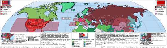 This map is a modernisation of an ancient one I did back in 2009. My how times have changed. It is done in the style of one of my favourite map artists, QuantumBranching. I'd recommend checking out his deviantart profile if you like my stuff, he is a big inspiration for me.This is the world of Atompunk, in the year 1975. The United States of America is embroiled in the middle of the ‘Cold War’ between it and the threatening Universal Soviet Union, with vast nuclear arsenals aimed at each other. It is closely allied with the British Empire and the European Commonwealth. The United States has changed little since the end of the Second World War in 1945, after the defeat of Nazi Germany and the meeting with the Red Army along the Vistula. The greater advance of the German Army against the Russians, reaching as far as the Volga frontier, gave the Western Allies more time to occupy territory and made the Russians seem far weaker than OTL. Within the US both economy and technology roared ahead in the immediate aftermath of the war. Technological advancement brought innovations such as the miniature nuclear reactor, advancements in robotics and (most recently) cordless telephone receivers. Blacks aren’t yet at equal rights, but they are far closer to it than any point before. The Civil Rights movement is gaining greater and greater momentum, it is believed by many that Black Suffrage to be achievable within the decade. There are also movements which turn to the more violent times of the 1960s, with frequent clashes between extremist Black supremacists and local militia, disrupting the usual happy family image America maintains abroad. It is hoped that this situation will soon be sorted out as it would the US greatly, since peace at home allows it to focus on its more troubled allies.
