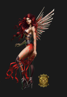 Erm... I see only three wings. Where's the fourth? A bit too red for me (sitck with the green!) but I love how her hair's whipping. That pose looks extremely uncomfortable.