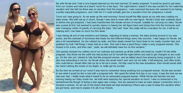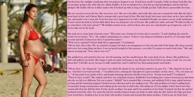 All my friends found their girlfriends at the beach, but after going to the beach every day for a month, I was still lonely. I waded into the sea and said “Oh, gods of the sea help me find a sexy woman and get laid.”. Suddenly my skin felt itchy all over, I shook my arms and legs in the water and watched my body hair float away, my limbs looked skinny, I put it down to the refraction of the water. Then I felt my shoulders being tickled. I shook my head and found long hair hanging down from my head. I then had a curious sensation like my chest had flaps that were floating and bobbing up and down in the waves, looking down I saw boobs on my chest, I squeezed the soft balls and found them sensitive. Suddenly I realized how weird this was, I moved my hands down to find shapely hips and between them a sensitive slit where my balls used to be. “Oh, my god, I’m a sexy woman!” I shouted. “You sure are.” said a surfer paddling by. That was 7 months ago now can you tell whether I got laid or not? I like to come to the beach and swim every day again now, it relieves the weight of my growing baby bump and breasts.Related content
