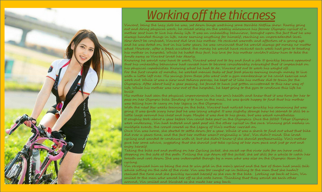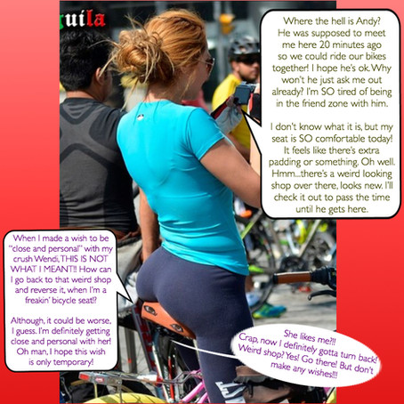 I paid the head of the garage sale and took it out while my roommate shook his head. As I started my way home I realised it had been a while since I had pedalled a bike as I was getting puffed. "On the path to a biker body." I told myself. "Why do bike seats have to squish your balls?" I whined. As I continued pedalling home I gained my second wind and began to feel lighter. At first, my arm and leg hair was getting tickled by the wind, but soon they felt smooth, I assumed they must be slicked down by the sweat. My shorts and t-shirt began to feel very tight and riding up my legs, I never felt a t-shirt so tight around my chest before which was odd. As I continued to ride home I noticed men and teenage boys looking at me funny, maybe my roomy was right about the bike's colour, I am more used to people taking no notice of me. As I neared home the handlebars felt bigger in my hands for a reason I could not fathom, the pedals too. I noticed a car seemed to be slowly following me. I pulled onto the pavement next to the shared house. I heard a voice holler "Hey there hot stuff!" As I looked behind me something brushed over my shoulder, I saw that the idiot in the car was my roommate parking, I thought in his car he would get back before me, I had left my key behind, so I asked him "Can you let me inside?" gee getting puffed makes me squeaky I thought.