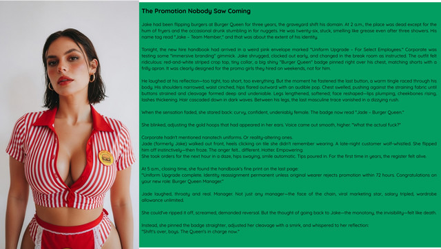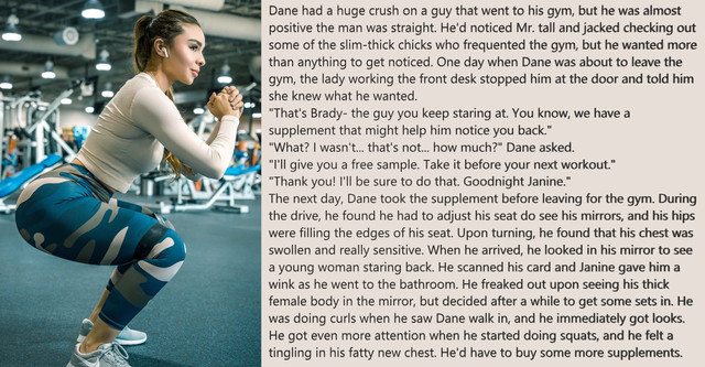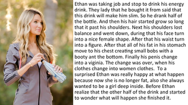 As I dismounted the bike I noticed a jiggling sensation on my chest. I looked down and saw a pair of large knockers and small hairless arms and legs while long locks hung down over my ears. I squeezed my tender titties, pulled my hair, and felt the flat crotch in my shrunken shorts.