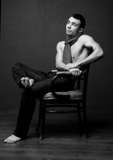 This is a perfect pose for the model--it really accents his body structure, those wonderfully long limbs... His expression fits it all quite well, also. This piece also manages to achive absolute blacks, which some of your others didn't--they were more gray and seemed washed out. Black blacks makes for a much more dramatic image, that's for sure. Nice work.