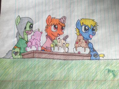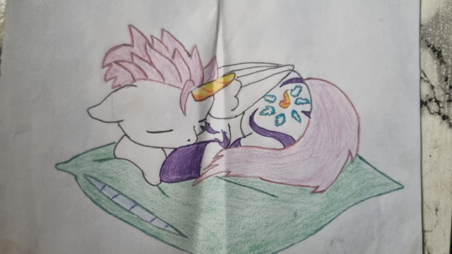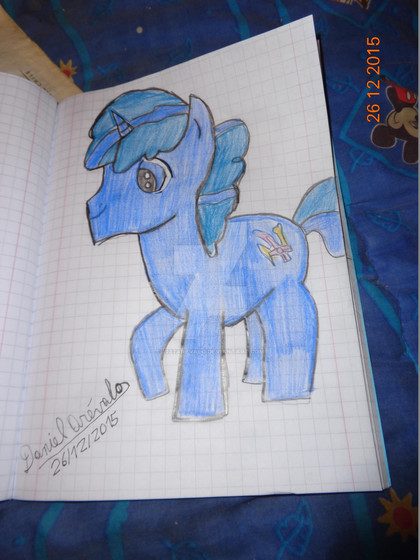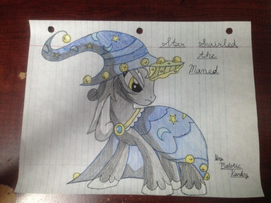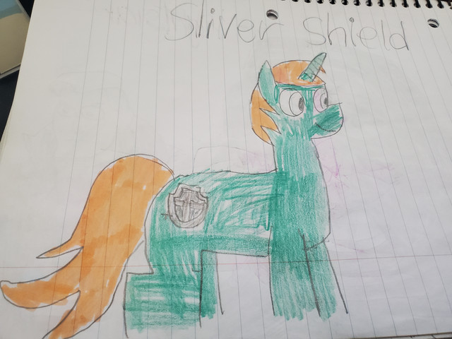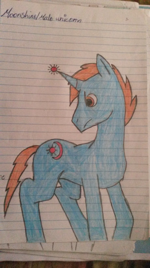 I really like her characters I'm hoping to do more of them. I had fun making this. Too bad I didn't think to make him into a alicorn before reading his bio again opp's well I'm going to make him alicorn for any other project's.I used color pencil's, and sharpie. I also used some masking tape to hold it down to the cabinet to get a good image.