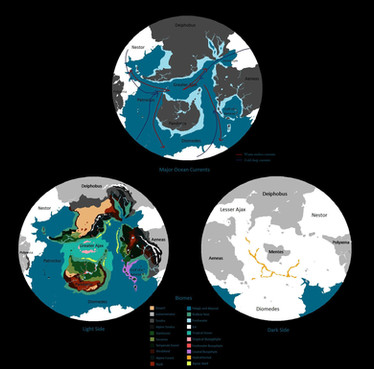 “The discoveries were astounding! The first satellite images from Barnard’s fourth planet revealed oceans and continents, dusted red-violet with flourishing plant life. The atmosphere was toxic to humans but rich in gasses common to Earth. The planet’s natural features, along with its tidally locked state, engendered an array of familiar biomes: tundra, rainforest, desert, and prairie among them, along with a few that didn’t fit the profile of any know biomes. Strong currents in the air and the seas moderated the climate and, most importantly, prevented the atmosphere from freezing on the dark side. The planet was given the proper name Ilion after the ancient city of Troy. In keeping with the ancient civilization theme, the other planets became Avaris, Tel Kabri, Ur, Vaishali, Heracleion Yingchang, Pompeii, and Cahokia.”