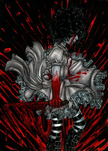 The third trailer for American McGee's Alice was so incredibly groovy~. I loved her outfit in it and so two doodles happened one of which I finished in between the usual 5-6 days a week of homework. I had some difficulties with the colors but oh well I am happy with the outcome.I plan to have my only commission's character designs ready for approval or changes and all that this week fingers crossed~! Things have been hectic as of late with family and school. My uncle passed away yesterday which was very sudden and saddening for everyone as he was far too young to have his time cut short already ):. (This was all more journal stuff than description for a picture now that I think about it but oh wells~.)