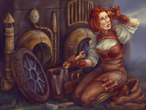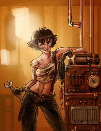 Just something I was toying around with for an evening or two between bigger projects. Nothing too polished, but it kind of feels like there's a story here.This is supposed to be the one-and-only Malla, one of my first original characters (and DA name source!), set in the engine room of some great steam-powered machine. She's usually in a much more Firefly-esque universe, but she fits in quite nicely with my recent obsession with the steampunk genre, too. I'm not too thrilled with how her facial structure turned out. It's much too soft for the girl I had in mind, but meh. This was a FOR FUNSIES painting anyway.