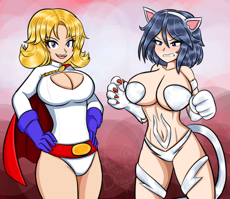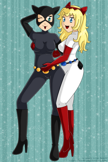 PowerGirl bearhuging a Catwoman plushiefor