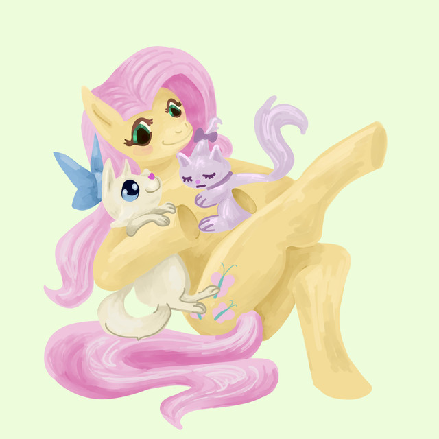 for a request onΒ picturesofponies of pan transfem Fluttershy with cat plushies!