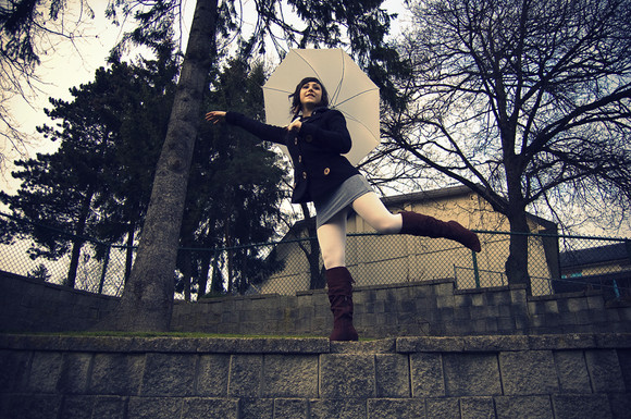 Something that stands out to me in this photograph is the subjects pose. It really makes it powerful in the sense that there is action going on and by her facial expression, she is really enjoying herself. Though her clothes are that of a similar color compared to the background, I find that her gloves and hair really make her stand out.