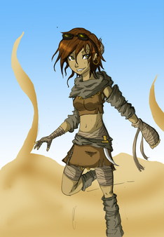 Another one of my desert riders, but not in the traditional clothes. This is one of the nomadic merchants, who don't spend a lot of time actually living in the desert, and so they don't need all the protective clothing.Behind the girl is a random sketchy drawing of the basic look of the Desert Rider's tents...