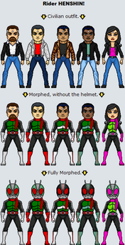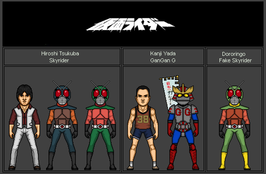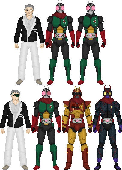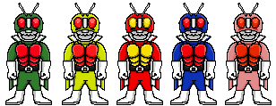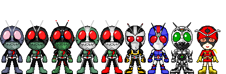 Here we have Rider 1, 2 and V3 from The First and The Next, the movies that attempted to modernize the original Kamen Rider stories then trailed off into a cliche j-horror story by the second film. But the suits were good. A shame those two oni dudes from the Den-O/Decade movie appear to be using remnants of their helmets and belts, which means we'll neeeever see them again. Sadface.Oh, and Riderman is here too! The All Riders VS Dai-Shocker movie featured Riderman telling Decade how much of a wimp he is to want to die for his actions instead of make up for them, and was portrayed by the musical sensation GACKT.