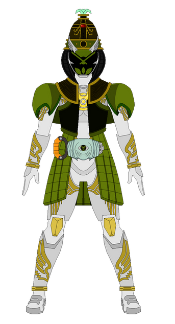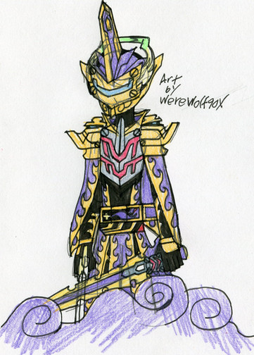 Because of the godly status, and Idunn being associated with apples as a key to eternal youth, it seemed likely this wouldn't be the standard Rider. Here's where it gets interesting: I went back to a scene where Ryoma Sengoku introduces himself to Kota and Kaito, and shows them sketches of other versions of the belt, which were far more organic and creepy - I ALWAYS wanted to find a place to use that, and this felt like a good place. It's the Gold Ringo Lockseed this time, because that just seemed more interesting to me as I was coloring it. Implies some similar origins as Malus and reduces how many apple Lockseeds there are.