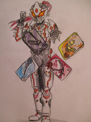 In honor of the Halloween season, the Girl Riders poll was about making an Another Rider design. Swing got it, which proved to be a fun challenge - it was decided that I would lean into the age difference and make it a short gremlin-y monster.There's design cues from Another Blade since she is a Rider from that setting, and I liked adding the tatthered oversized bowtie as well as ripped sleeves. The Another Rider aesthetic is all about looking at a suit design and figuring out how to twist it. I decided to have some fun for the background and have floating poker chips coming from a crack in the ground, which turned out to be a good way to get some ominous lighting.