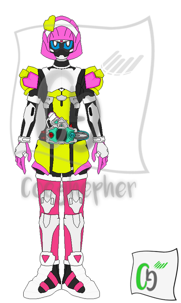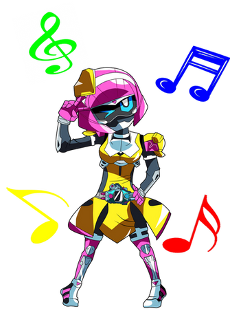 I tweaked the chest armor to fit her frame the same way her own default form does, then relocated the speakers to her legs, giving her double the speaker power. For the helmet I turned her hair band into headphones, with the mic and visor from Brave's Beat Quest Gamer form. And of course, color changes were made using Poppy's metallic pink and white, with tweaks to her own suit colors.