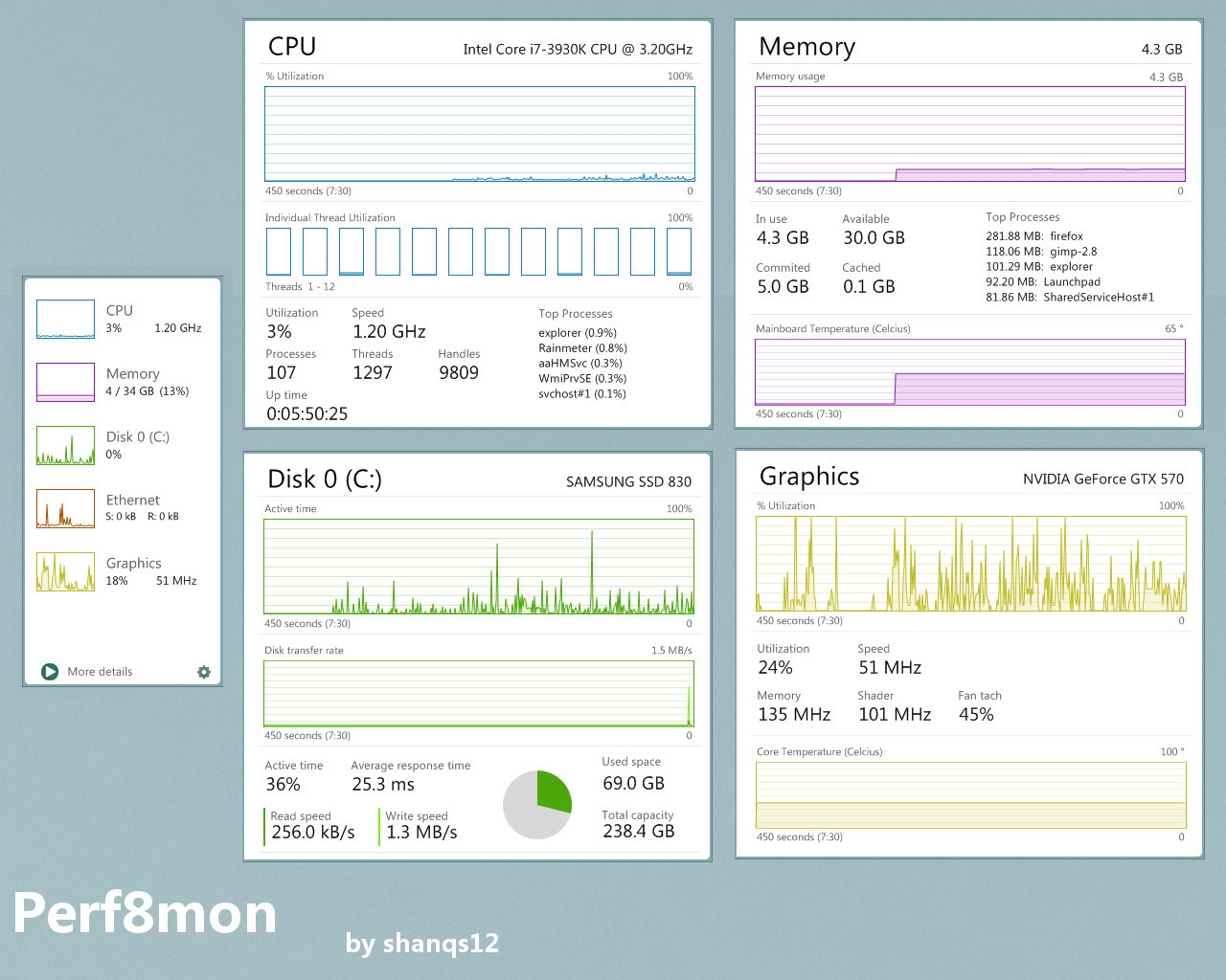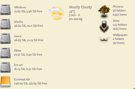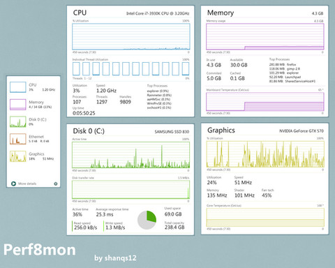 There is a CPU, Ram, Swap, Download, Upload graph and a drive read/write for drive C,D,E,F,G,I, and a physical HDD read/write skin, you can move them wherever you want.each one is a 140x43 pixels