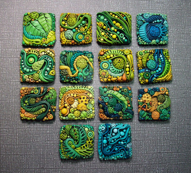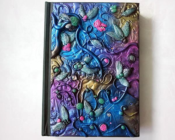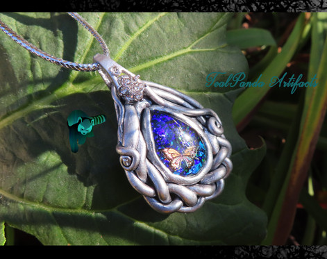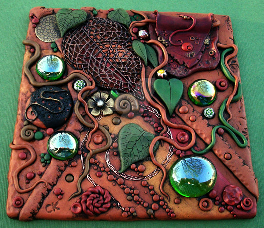 This ACEO is made of polymer clay with an iridescent blue glass gem. It measures 2.5" x 3.5" and was painted with acrylic and metallic paint.It reminds me of a seed pod that has burst open