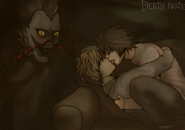 jajajajajaja ryuk esta como diciendo "aaahhhhww pero que gays" y rem esta diciendo "que coΓ±o le pasa a estos 3" y misa "NOOOOOO!!! light porqueee!!!" XDD jajajajajajaa