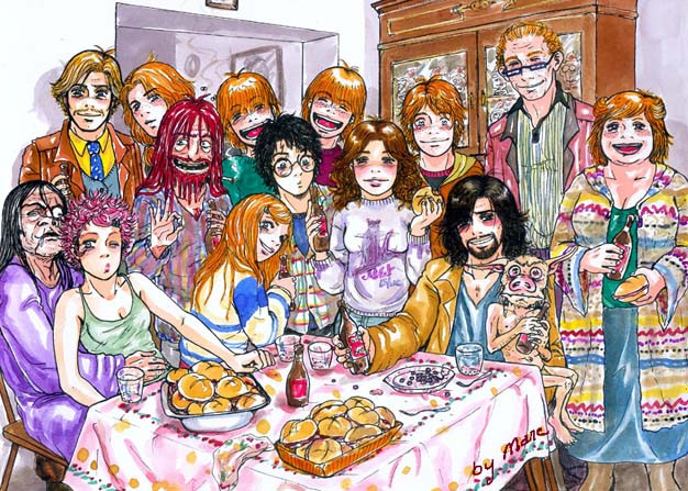 Hola, chavales! os subo este pic fiestero, espero que os guste. Fue particularmente difícil iluminar los diferentes personajes para que quedaran diferenciados y a la vez compensados los colores >__< pero me gustan este tipo de retos XDDDD Aquí aparte de los merodeadores de siempre podreis encontrar a otros personajes del douji, a los malos XDDD e incluso a algunos profesores y Hagrid. Se trata de una fiesta de fin de curso, me apetecía dibujar a Lily y James juntosHello, everybody!